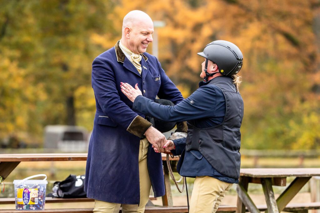 Das Stelldichein hatte sich etwas in die Länge gezogen, weil wir noch auf zwei Reiter warten mussten, die Tillmann-Brüder wollten ja auch kommen. Wer sie nicht kennt: Gilbert feierte 2013 seinen Derbysieg im 84. Deutschen Springderby und sein Bruder Frederick, der 2025 den 4. Platz erreichte. Als die Beiden dann angekommen waren, sagte Jan ein paar Worte und wir machten unsere Pferde fertig.