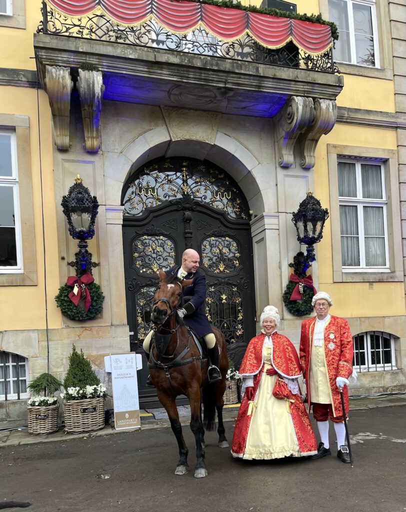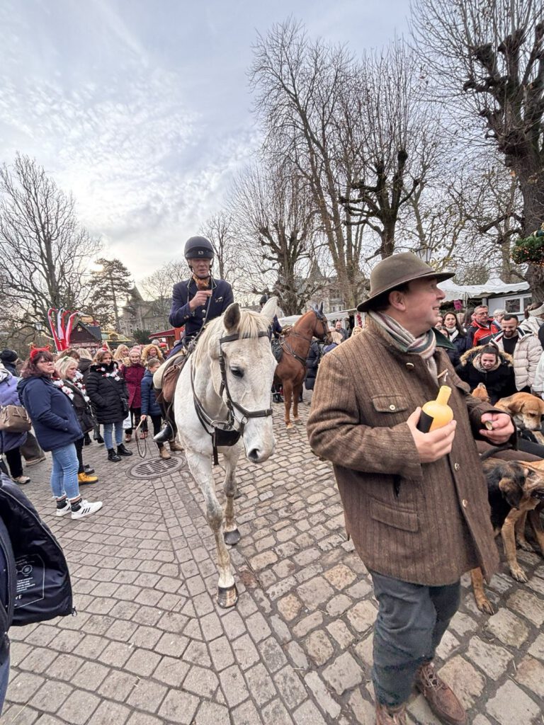 Ganz bezaubernd für uns war ein Händler, der Eierlikör und viele andere leckere Spirituosen verkauft hat, bis hin zum Gin. Als wir vor seinem Stand verharrten und vor uns die Menschenmasse stillstand, fragte ich, ob er etwas Leckeres ausgibt? Ohne Murren nahm er den Eierlikör und Becher und zögerte nicht lange, uns einen auszugeben. Plötzlich standen sehr viele Menschen um seinen Stand herum und trauten ihren Augen nicht, dass die Hunde so locker vor dem Stand bei uns standen. Wir bedankten uns bei dem Betreiber und ritten weiter.